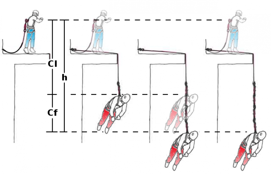 - Caduta frenata: entra in funzione il dissipatore composto principalmente dall'assorbitore di energia, ma anche dagli altri elementi della catena di trattenuta quali imbraco, cordini ed elementi del sistema di ancoraggio;
